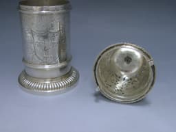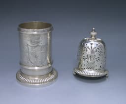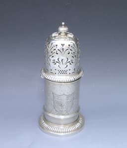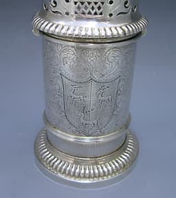 A splendid William and Mary antique silver “Lighthouse” caster. The caster is of cylindrical form, with the bayonet fastened high-dome cover pierced...