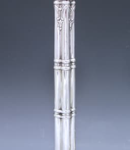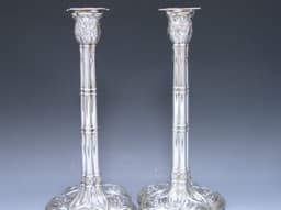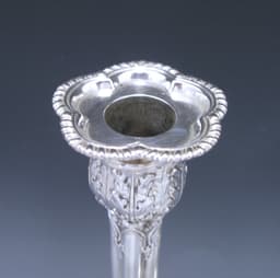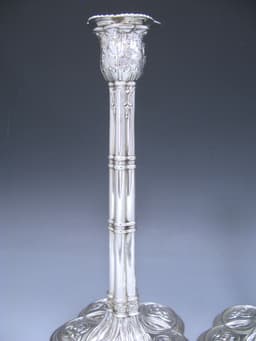 A rare pair of gothic taste candlesticks, formed as gothic cluster columns with classical capitals. The candlesticks stand on cinquefoil five leaf bases.